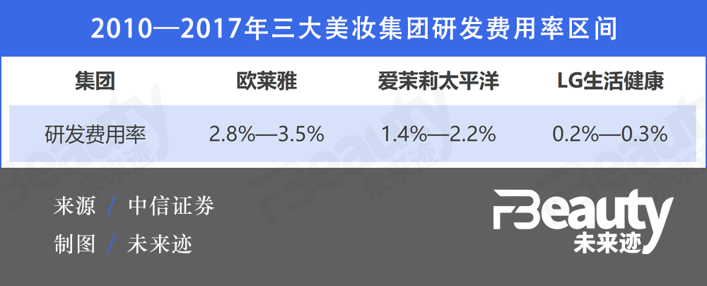 這其中,研發(fā)實(shí)力是高端消費(fèi)市場(chǎng)的一個(gè)重要壁壘,長(zhǎng)期以來,歐萊雅等巨頭對(duì)于研發(fā)的大量投入,讓他們擁有了雄厚的技術(shù)資本,根據(jù)中信證券數(shù)據(jù),2010-2017年期間,歐萊雅集團(tuán)的研發(fā)費(fèi)用率達(dá)2.8%-3.5%,遠(yuǎn)高于愛茉莉太平洋和LG生活健康。