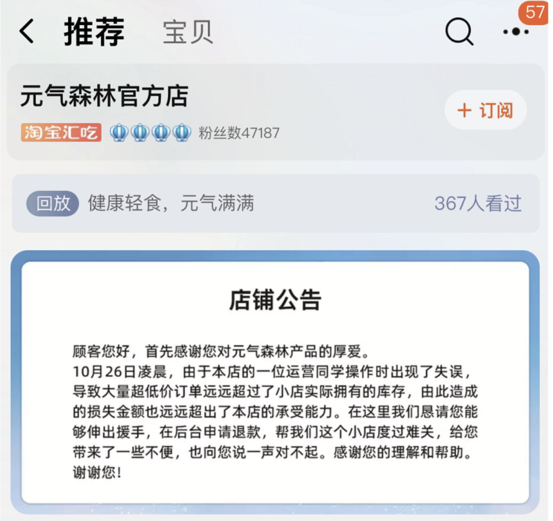 發(fā)現(xiàn)失誤后,涉事的元氣森林官方店緊急下架了所有商品,并且在不久后發(fā)布公告,稱由于運營失誤導(dǎo)致大量低價訂單遠超實際庫存量,造成的損失金額也遠遠超出了本店的承受能力,懇請消費者伸出援手在后臺申請退款。