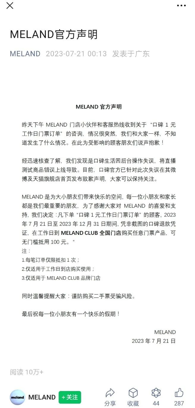 最后,MELAND也發(fā)布了聲明,解釋了起因和處理結(jié)果,表示將贈送下單“口碑1元工作日門票訂單”的顧客一張100元無門檻抵扣券用作補償。