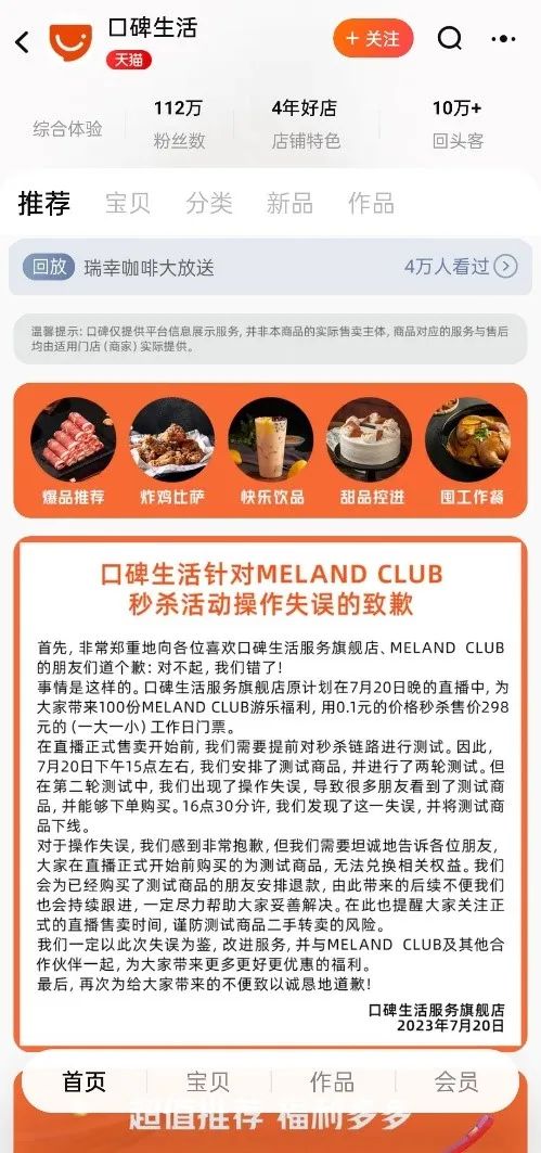 根據(jù)口碑生活服務(wù)旗艦店首頁的致歉聲明,口碑生活原計劃在7月20日晚的直播中,帶來100份MELAND CLUB的秒殺商品,店鋪在直播售賣開始前對秒殺鏈接進行測試,但在進行第二輪測試時出現(xiàn)操作失誤,導(dǎo)致很多消費者看到了測試商品并能夠下單購買,后續(xù)發(fā)現(xiàn)這一失誤后就將測試商品下線。