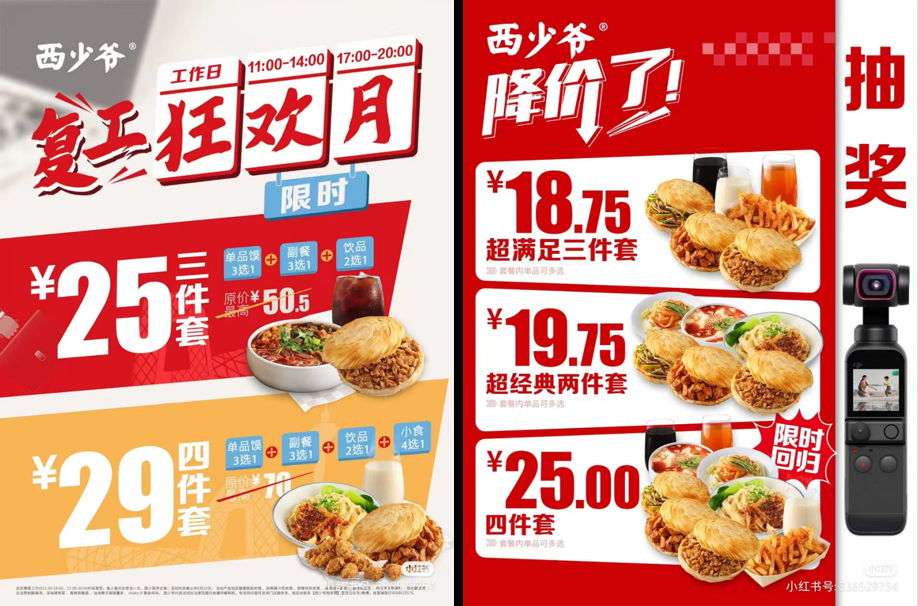 近段時(shí)間,西少爺推出了多款價(jià)格優(yōu)惠的餐品及套餐。比如酸辣粉9.9元/碗;包含2個(gè)肉夾饃、1碗面食、1杯飲品的“雙饃四件套”,只需要25元。