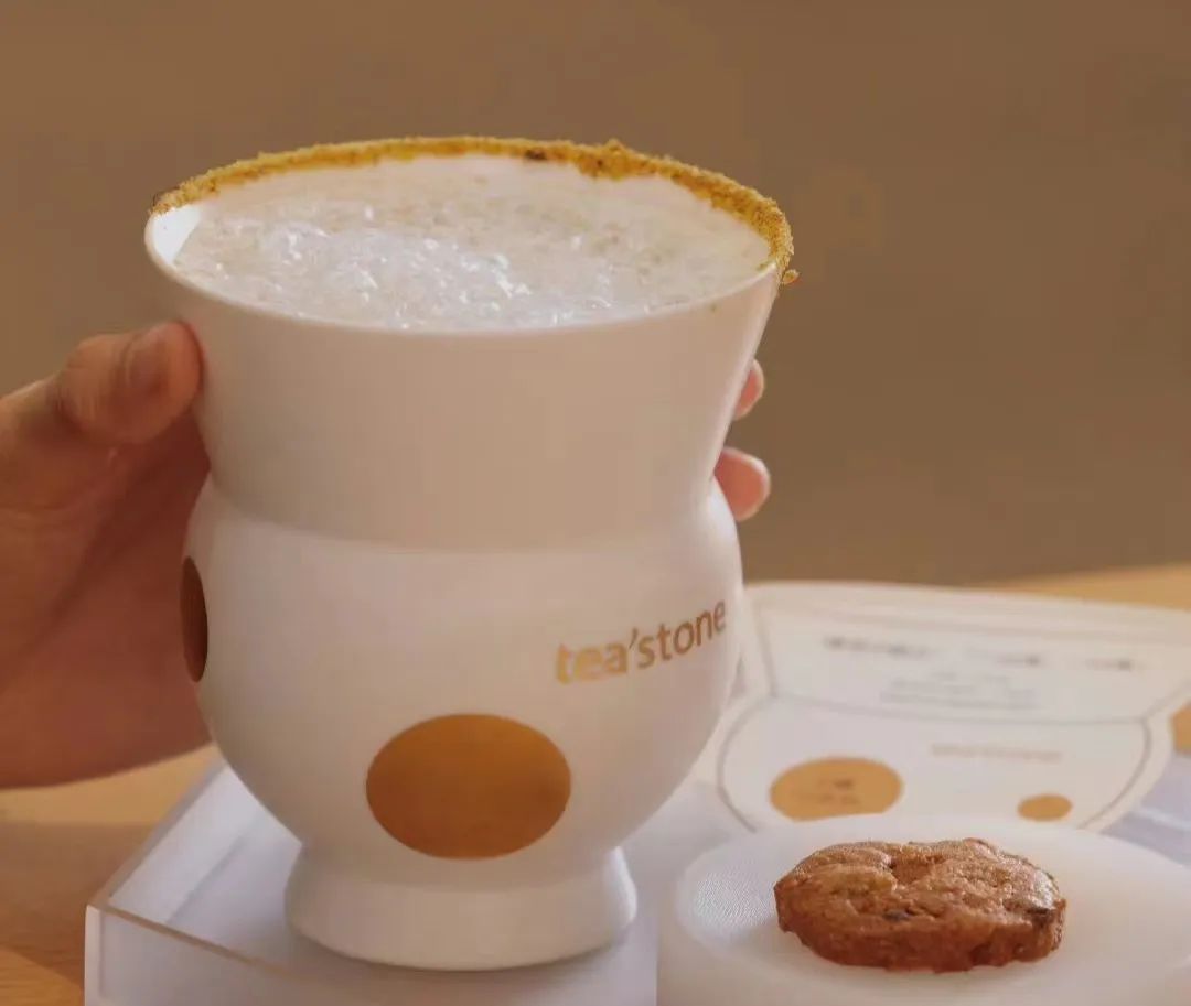 比如,tea’stone的靈感特調(diào)茶鹽邊乳茶,在使用智能萃茶機高溫萃取茶湯后,注入沾有鹽邊的杯子中,水牛乳不經(jīng)過復(fù)配直接由機器高溫制成奶泡,與茶湯混合,健康屬性明顯。