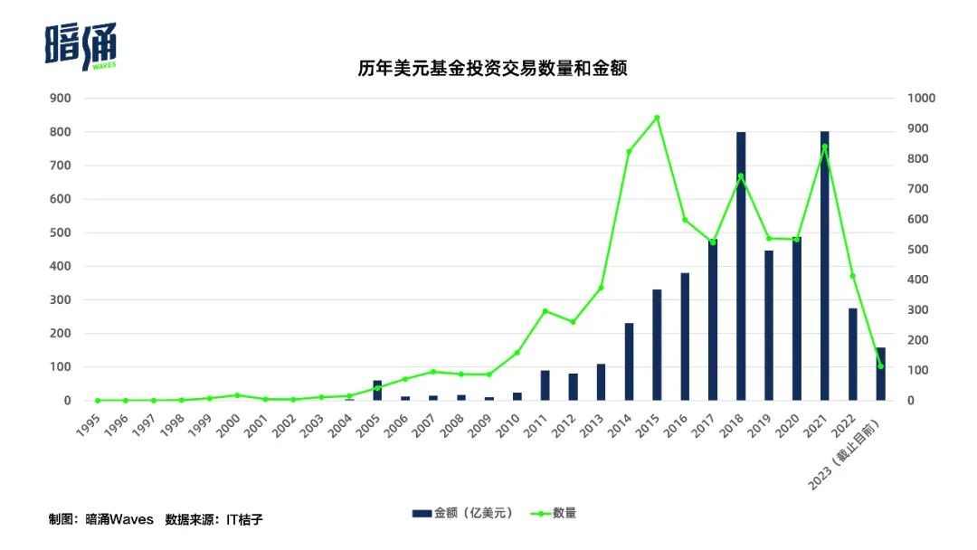 另一組數(shù)據(jù)更為直觀。根據(jù)IT桔子實(shí)時(shí)統(tǒng)計(jì),國(guó)內(nèi)市場(chǎng)中的美元基金2005年的投資交易金額僅為60億美金,這一數(shù)字在2018年和2021年達(dá)到頂峰——都近乎800億美金,又在此后急轉(zhuǎn)直下:2023年至今僅為157億美金。