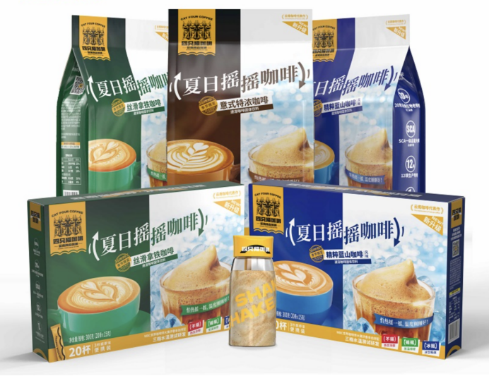 借助地域之便,四只貓?jiān)诠境闪⒅蹙徒斯S。根據(jù)公開信息,四只貓擁有國內(nèi)唯一5條全自動生產(chǎn)線,三合一速溶咖啡年產(chǎn)量達(dá)3萬噸,日發(fā)貨包裹量最高可達(dá)20萬單。