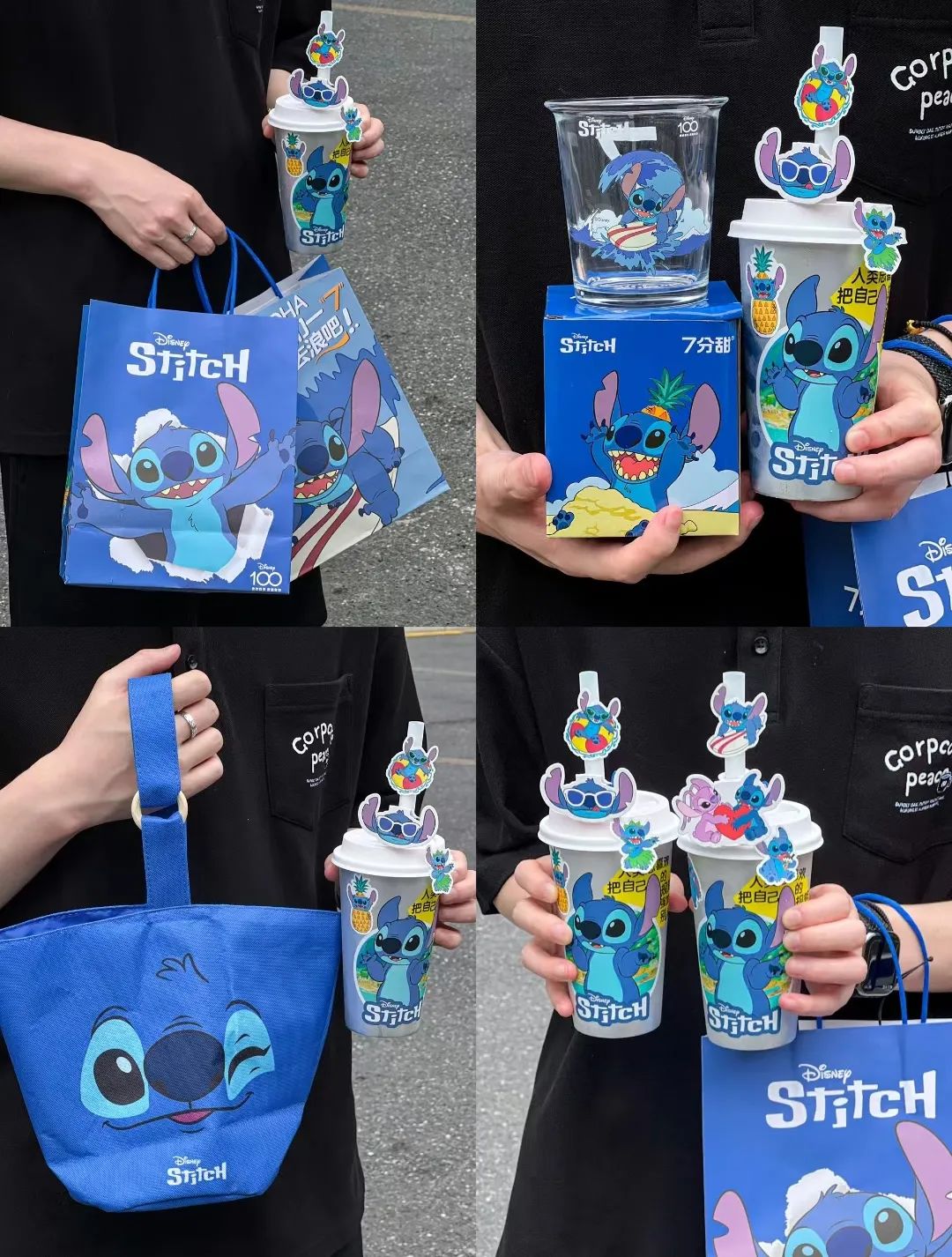 第一波聯(lián)名新品,是史迪奇系列的夏日新品,包含了桃李淘七、蜜桃火龍果奶昔等產(chǎn)品,聯(lián)名周邊有貼紙、玻璃杯、杯塞、便當包等。