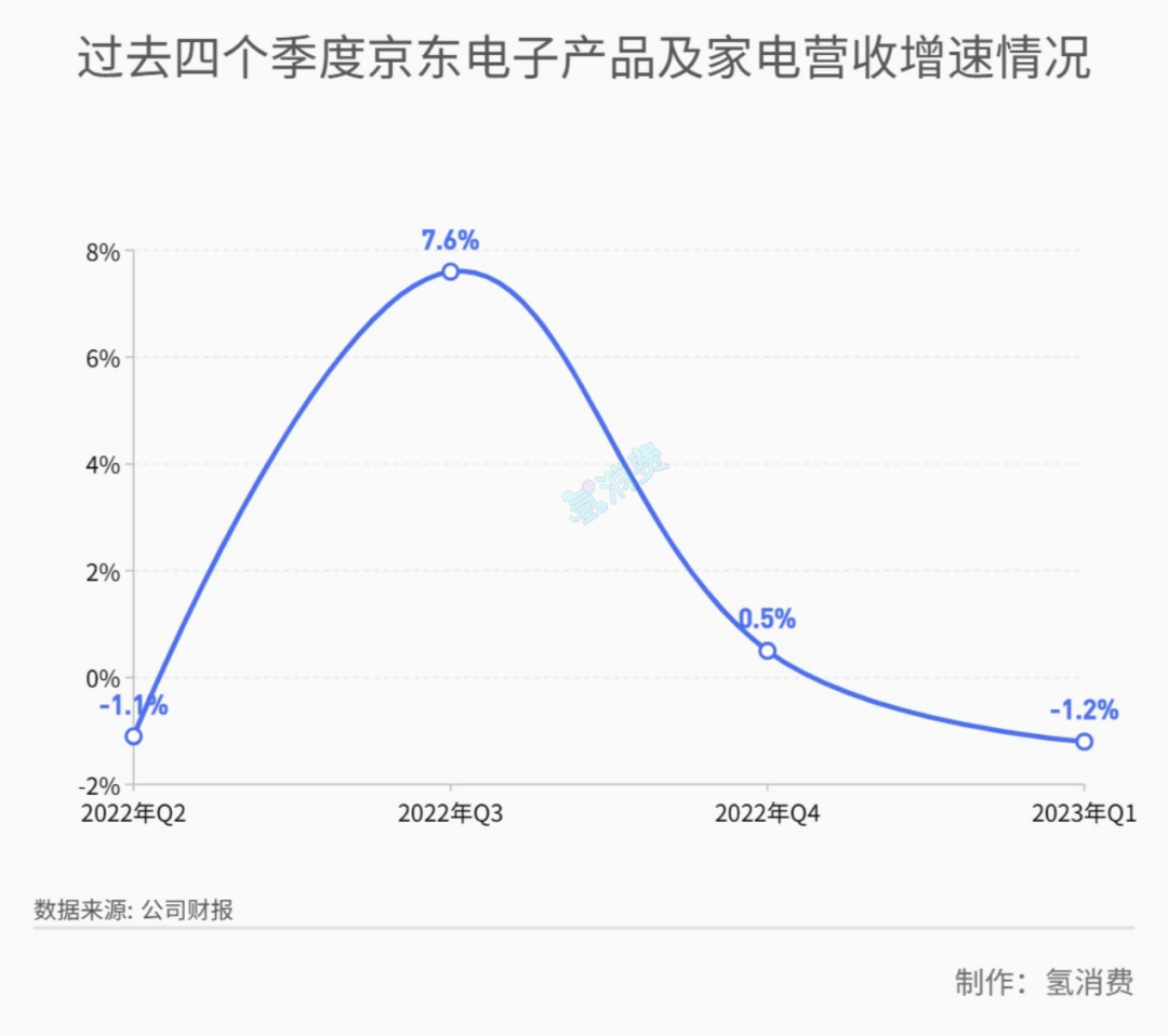 *過去四個季度,京東的基本盤3C產(chǎn)品營收增速直線下滑,2023年Q1已處于負(fù)增長
