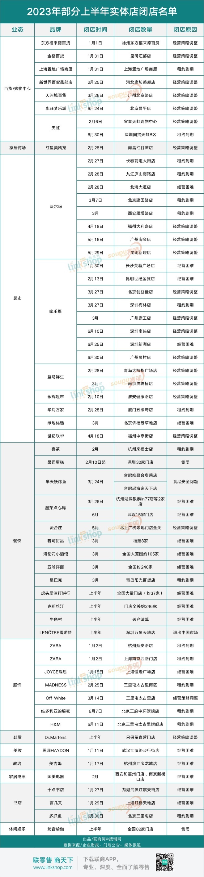 據(jù)《聯(lián)商網(wǎng)》不完全統(tǒng)計(jì),截至到2023年6月30日,包括百貨/購(gòu)物中心、超市、餐飲、服飾、美妝、家電等業(yè)態(tài)的實(shí)體店關(guān)店數(shù)量高達(dá)1000+家。毋庸置疑,三年的疫情對(duì)實(shí)體商業(yè)的沖擊是巨大的,因疫情被迫關(guān)門(mén)的品牌也不在少數(shù)。不過(guò)進(jìn)入2023年,在全國(guó)疫情全面放開(kāi)后,實(shí)體店仍然存在“疫情后遺癥”。