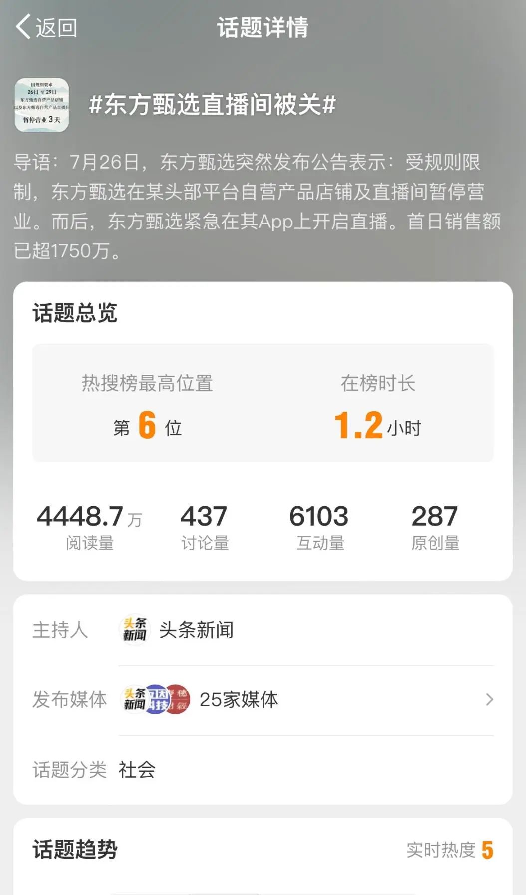 這一手臨時的補救措施,把面子和里子都做到了完善。對于近日極力拓展自建APP渠道的東方甄選來說,這次突發(fā)情況甚至不能算是壞事,反而像打了一場免費的廣告:東方甄選直播間被關等話題今日下午已經(jīng)登上微博熱搜,獲得千萬量級曝光。