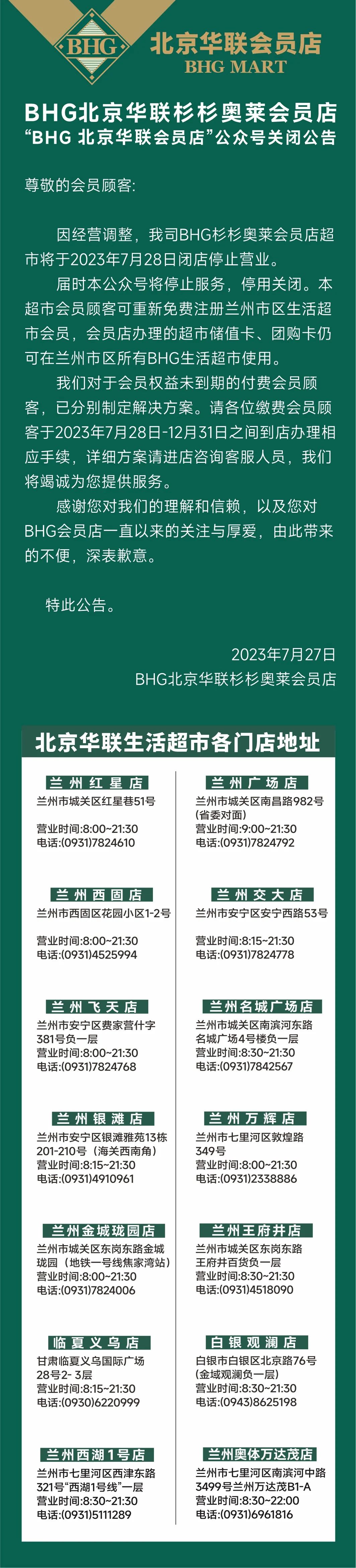 公告顯示,因經(jīng)營(yíng)調(diào)整,北京華聯(lián)BHG杉杉奧萊會(huì)員店超市將于2023年7月28日停止?fàn)I業(yè),本超市會(huì)員顧客可重新注冊(cè)蘭州市區(qū)生活超市會(huì)員,會(huì)員店辦理的超市儲(chǔ)值卡,團(tuán)購(gòu)卡仍可在蘭州市所有bhg生活超市使用。