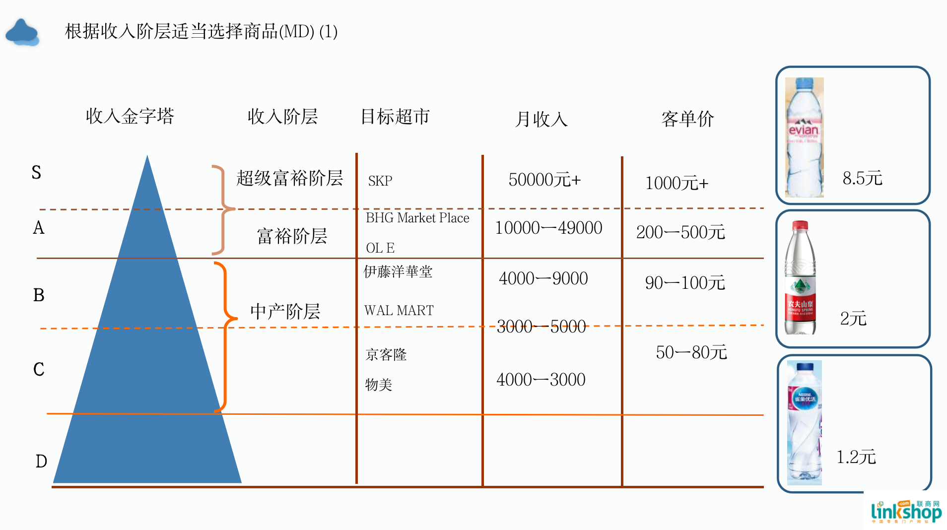 在超市里大家通過對于消費者收入的劃分,包括客單、目標(biāo)超市等等,看到我們賣的是一瓶水。這個水它體現(xiàn)的是什么?體現(xiàn)出來了我們消費者關(guān)于健康的一個追求。它不是水,更多被賦于了關(guān)于生活方式的思考。