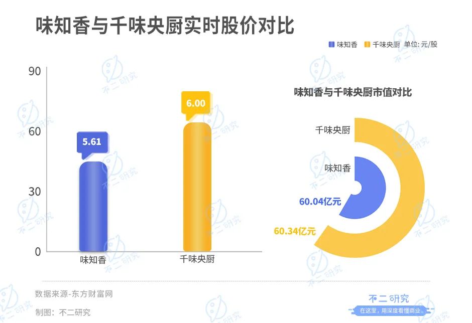 截至7月28日收盤,味知香報收43.51元/股,對應市值60.04億元;千味央廚報收69.64元/股,對應市值60.34億元。
