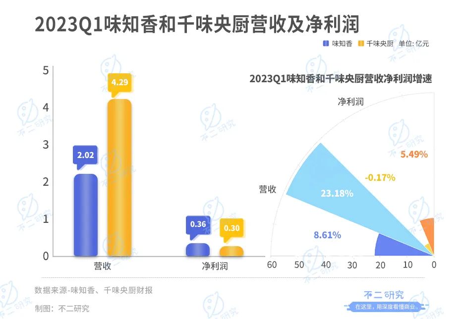 「不二研究」據(jù)兩者的一季報發(fā)現(xiàn):今年一季度,味知香、千味央廚的營收分別為2.02億元和4.29億元;營收增速分別為8.61%、23.18%。