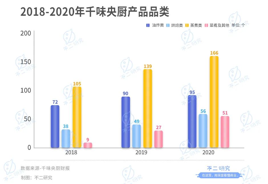 而千味央廚則公布了其詳細SKU分布,截止2020年底共擁有368個產(chǎn)品品類,包括95個油炸類產(chǎn)品、56個烘焙類產(chǎn)品、166個蒸煮類產(chǎn)品、51個菜肴類及其他產(chǎn)品。