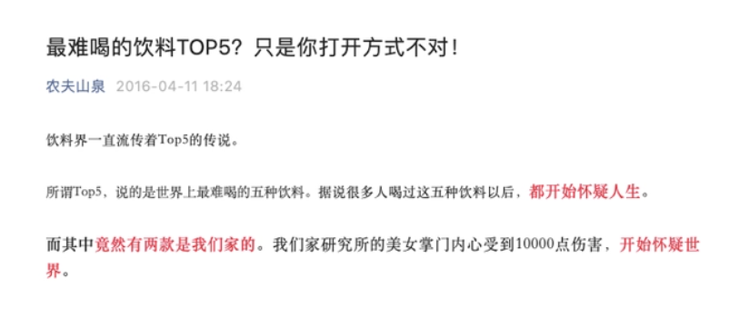 甚至在2016年,東方樹葉被網友列為中國最難喝的飲品top5,被不少人吐槽“隔夜茶”。農夫山泉官方直接發(fā)文喊冤,稱東方樹葉的原材料都非常頂級,甚至“拿一點東方樹葉的茶葉原料回家沖泡,很可能秒殺你爸爸泡的茶”。
