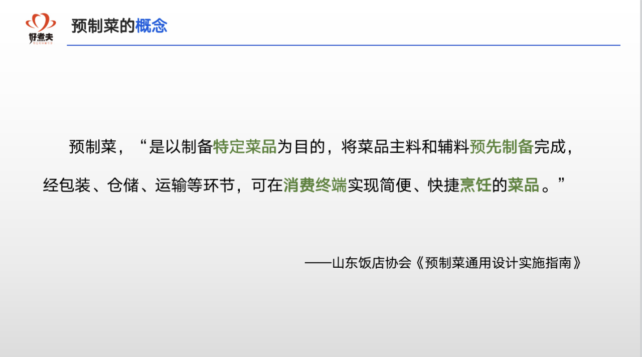 你會發(fā)現(xiàn),慢慢地預(yù)制菜這個(gè)概念把我們傳統(tǒng)的食品行業(yè)所有的產(chǎn)品都快包進(jìn)去了,如果認(rèn)為這些所有東西都叫預(yù)制菜,其實(shí)我們就相當(dāng)于是新瓶裝舊酒。在這個(gè)行業(yè)里面每個(gè)人說自己是預(yù)制菜的時(shí)候理直氣壯,但是你要說別人不是預(yù)制菜的時(shí)候就是耍流氓。現(xiàn)在急需對預(yù)制菜做一個(gè)標(biāo)準(zhǔn)出來,下圖是引用我參與過的標(biāo)準(zhǔn),就是山東餐飲協(xié)會的預(yù)制菜指南的標(biāo)準(zhǔn)。