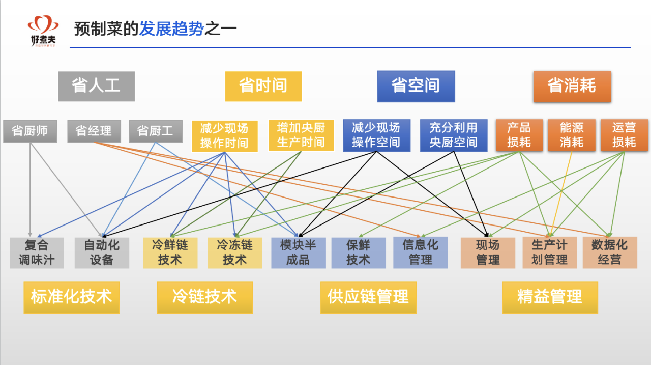 你能不能在不同的場景下做出滿足不同需求的C端產(chǎn)品來。從B端的需求出發(fā),預(yù)制菜怎么去給我們的客戶節(jié)約成本,大概包括人工、時(shí)間、空間、消耗。人工包括管理人員、廚師、廚工,時(shí)間減少我們終端現(xiàn)場的操作時(shí)間,延長后邊工廠加工的時(shí)間,省空間包括節(jié)省現(xiàn)場的操作空間,就是你的廚房、你的門店廚房和前廳的占比要越來越小,小廚房、大前廳。充分利用央廚的空間,省消耗包括本身產(chǎn)品的損耗、運(yùn)營的消耗和過程中的損耗。標(biāo)準(zhǔn)化的技術(shù)、冷鏈技術(shù)、供應(yīng)鏈的管理、精益管理,大家會發(fā)現(xiàn)不同的技術(shù)在給你省不同的成本。