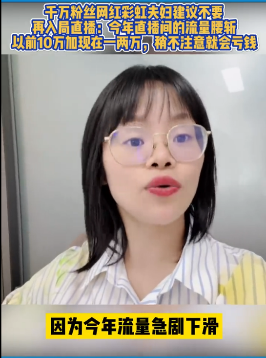 今年5月份,抖音千萬粉絲博主彩虹夫婦就發(fā)出建議:“普通人不要再入局直播了,以前總是10萬加的直播間,現(xiàn)在幾乎都是一兩萬人……稍不注意就會虧錢!