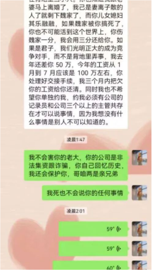 對(duì)話(huà)中,魏文軍還放話(huà)道,“我和公司在外面欠債2個(gè)多億,我也不會(huì)差你一分工資!”