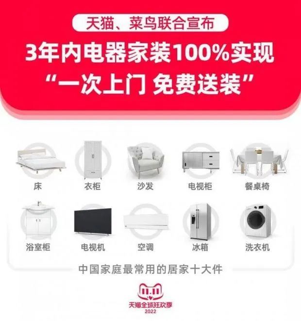 2022年10月,天貓和菜鳥聯(lián)合宣布未來3年天貓大件電器家裝商品將實現(xiàn)100%“一次上門、免費送裝”。同時,菜鳥宣布投入10億元,建立一支1萬人規(guī)模的末端送裝師傅團隊。