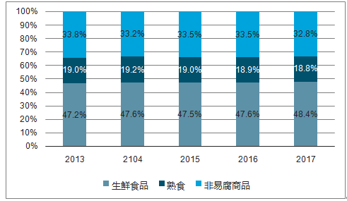 全食超市以有機(jī)生鮮經(jīng)營為主。商品結(jié)構(gòu)中生鮮熟食比例較高,尤其是即食性餐飲比例大大高于同業(yè)其他競爭對手,占比接近20%。主要食品組成圖如下: