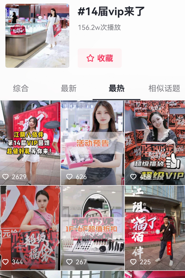 通過(guò)直播,可以更好的展示的產(chǎn)品并與觀眾互動(dòng),吸引更多人關(guān)注,以7月8日小程序直播為例,這次活動(dòng)不僅有超過(guò)3000+的超級(jí)福袋,而且針對(duì)不同品類設(shè)置了多檔福袋,挖掘私域平臺(tái)客戶消費(fèi)轉(zhuǎn)化。據(jù)悉,本場(chǎng)直播專場(chǎng)曝光量破2.5萬(wàn),同比增長(zhǎng)78%。在活動(dòng)期間,門(mén)店邀約多名抖音達(dá)人探店,并利用抖音等自媒體宣傳渠道進(jìn)行宣傳,利用話題功能將自己的內(nèi)容推送給更多用戶,在總體曝光量超百萬(wàn)的同時(shí)提高了品牌知名度。據(jù)統(tǒng)計(jì),關(guān)于江陰八佰伴的#14屆VIP來(lái)了#話題下的播放量更是高達(dá)156.2萬(wàn)。整體線上渠道(公眾號(hào)、視頻號(hào)、抖音、小紅書(shū))曝光182.1w,同比增長(zhǎng)30%,這一切都表明了新型營(yíng)銷(xiāo)手段對(duì)商業(yè)發(fā)展的重要性和影響力。