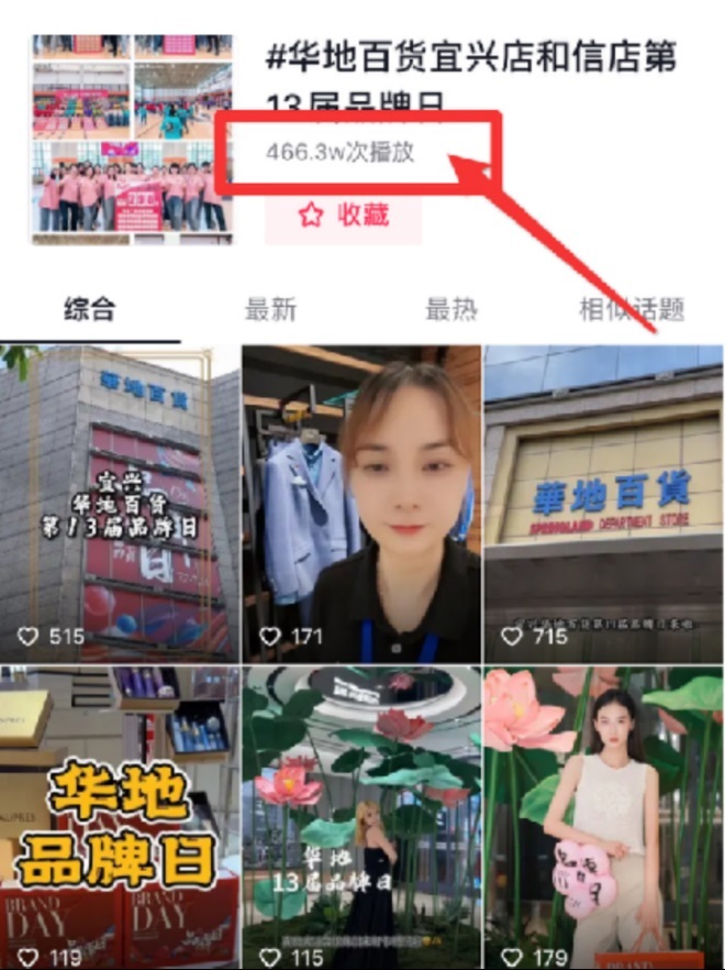 結合品牌日巨型荷花/巨型購物袋/報紙風等多重創(chuàng)新話題,通過內部一千多號員工聲浪發(fā)聲賽,霸屏小紅書、視頻號、抖音等各大新媒體平臺!其中抖音獲得了近500W+的曝光量!