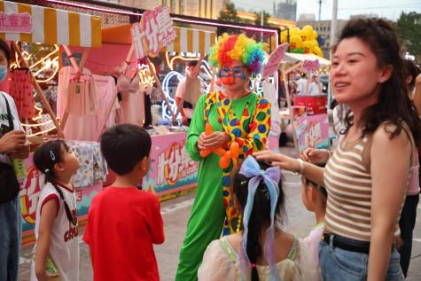 在巨型熱氣球腳下,便是“粉集”,一排排市集攤位和展開(kāi)著的后備箱,穿插于繁華霓虹燈之中,格外熱鬧。幸運(yùn)顧客還會(huì)遇見(jiàn)免費(fèi)送氣球的小丑,為粉集之夜增添樂(lè)趣;茨习税郯闉轭櫩途奶暨x市集品類(lèi),在這場(chǎng)市集中,顧客可以選購(gòu)包裝精美的花束送給身邊的人,可以品嘗一下買(mǎi)一贈(zèng)一的CoCo都可奶茶,可以為自己挑一件舒適的居家服,能看到大家耳熟能詳?shù)膭?dòng)漫周邊,還可以和開(kāi)著奔馳、賓利的攤位老板聊聊天。