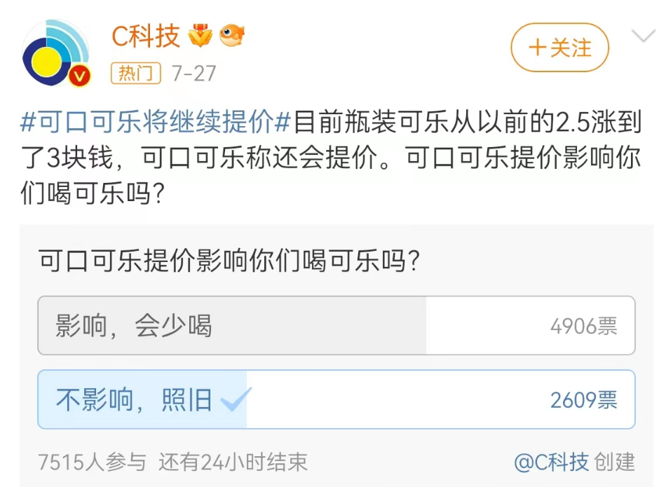 同時(shí),C科技在微博發(fā)起的一項(xiàng)投票中,超過六層的消費(fèi)者表示可口可樂的提價(jià)會(huì)導(dǎo)致自身減少購買可口可樂的次數(shù),僅有不到四層的消費(fèi)者表示不受影響。