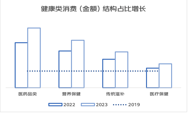 - 健康保健消費持續(xù)上升。過去四年中,人們前所未有地關(guān)注健康類消費。一些此前并不占太高消費比重的醫(yī)護保健品類逐漸被人們所重視。