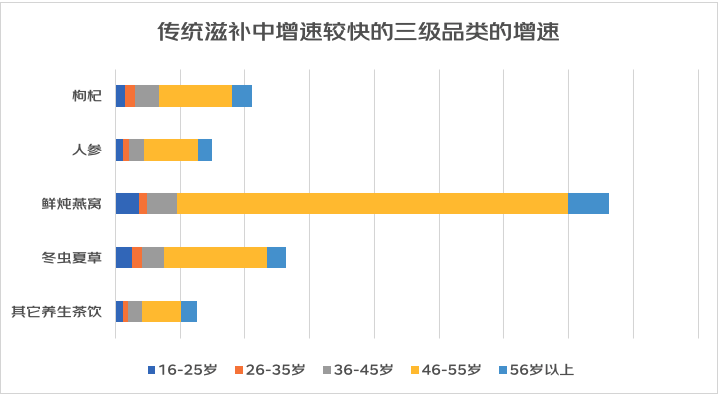 傳統(tǒng)滋補品類結(jié)構(gòu)增長112.6%,四年增長263%,在增速較高的三級品類中, 鮮燉燕窩成交金額四年增長120倍,其中46-55歲的群體增速較高。