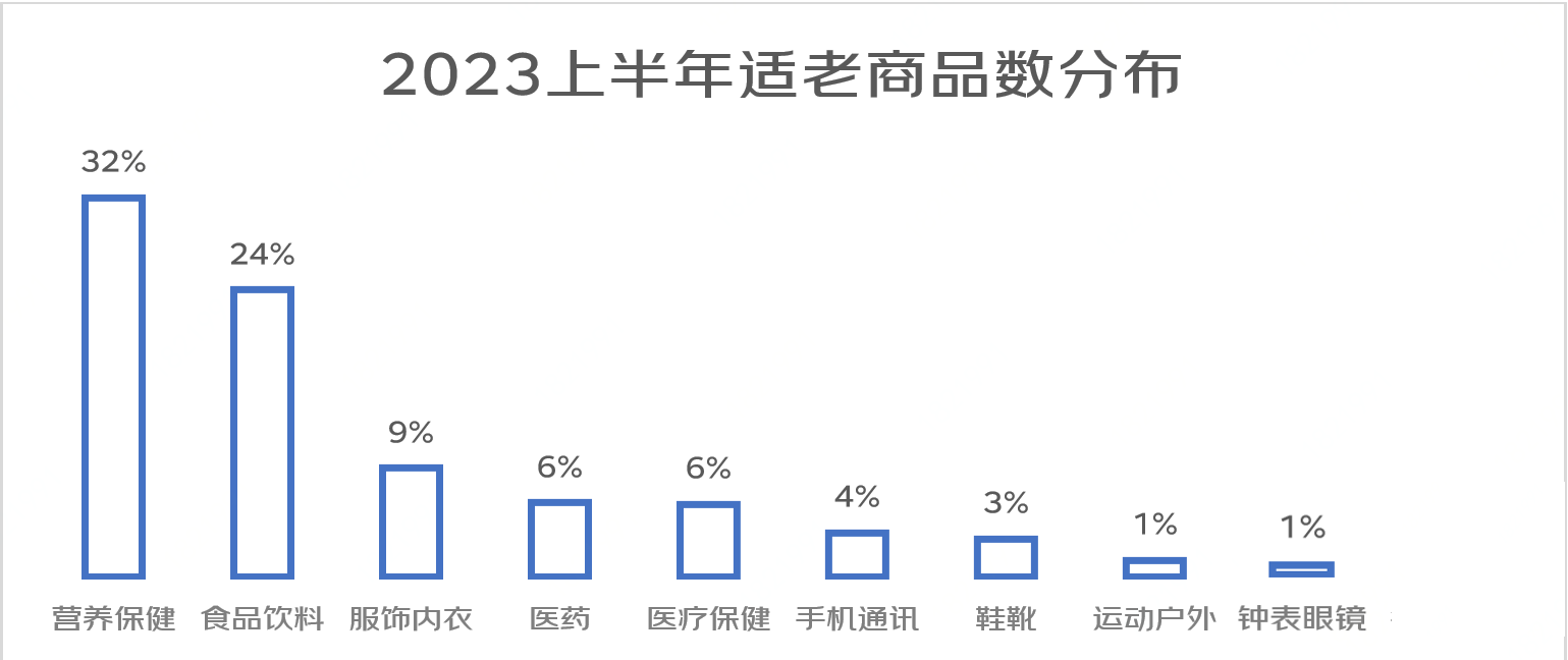 2023上半年,線上適老商品的數(shù)量超過2019年同期的2.1倍。2023上半年,適老商品集中在“吃的”品類。在線上銷售的適老商品中,營養(yǎng)保健、食品飲料的商品數(shù)占比達到56%,服飾內(nèi)衣的商品數(shù)占比9%,醫(yī)藥、醫(yī)療保健品類的商品數(shù)占比都在6%以上。在適老商品的供給方面,老年生活所需的家居、電子商品、休閑娛樂等領(lǐng)域的商品數(shù)不高,在產(chǎn)品研發(fā)方面還有很大的空間,在市場競爭上也存在著很多待開發(fā)的藍海領(lǐng)域。