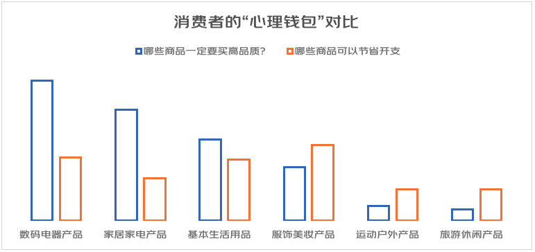 當下,在消費者心目中,消費電子、家居和生活用品是“品質(zhì)優(yōu)先”的,而相比之下,服飾美妝、運動戶外、旅游休閑則進入可以“節(jié)約”的品類。