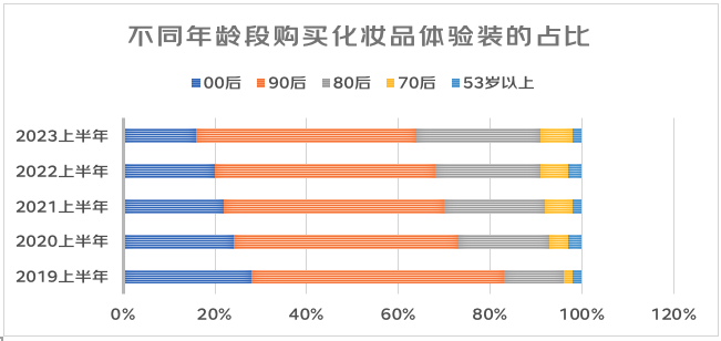 從年齡段來看,“大牌體驗裝”最大的消費人群是90后,他們買走了近50%的化妝品體驗裝。第二大消費人群從00后轉(zhuǎn)移到80后,80后的消費占比從2019上半年13%上升到2023上半年27%。