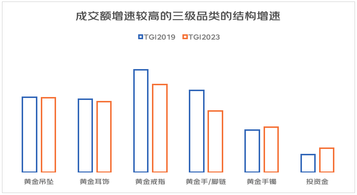 從結(jié)構(gòu)變化來看,成交額增速較高的品類偏好也在發(fā)生變化。傳統(tǒng)的戒指、手/腳鏈的金額占比所有下降,但手鐲、投資金的占比有明顯上升。
