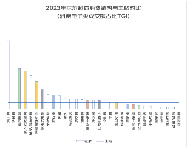 有意思的是,對比2023年京東APP主站與全國各超體店的消費電子(成交額)結(jié)構(gòu)差異可見,以消費電子為例,線上線下的消費結(jié)構(gòu)有很大的不同。