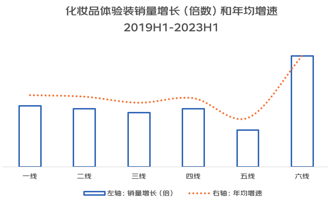 近5年,縣域農(nóng)村地區(qū)購買化妝品體驗裝的銷量占比明顯上升,從2019年上半年的17%,上升到2023年上半年的29%,近3成的護膚美妝體驗裝賣到了縣域農(nóng)村。