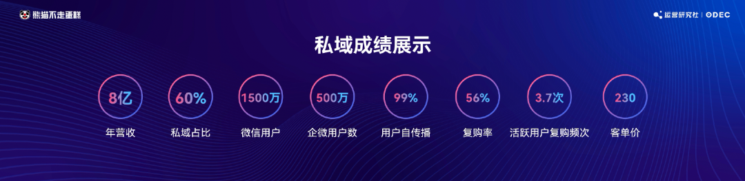 我們先來看一組熊貓不走最新的私域數(shù)據(jù):年營收 8 個億;私域渠道營收占比 60%,微信用戶 1500 萬,企業(yè)微信用戶 500 萬,復(fù)購率 56%,活躍用戶復(fù)購頻次 3.7 次,客單價 230 元。