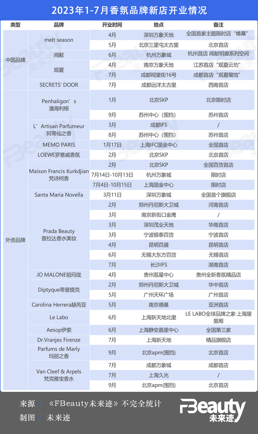 頭部企業(yè)們拿真金白銀砸出的市場動作就是最好的佐證。據(jù)《FBeauty未來跡》統(tǒng)計(jì),2023年上半年,已經(jīng)有接近20個(gè)國內(nèi)外香氛品牌在北京、上海、深圳、杭州、南京和鄭州等一線和新一線城市開設(shè)線下店。