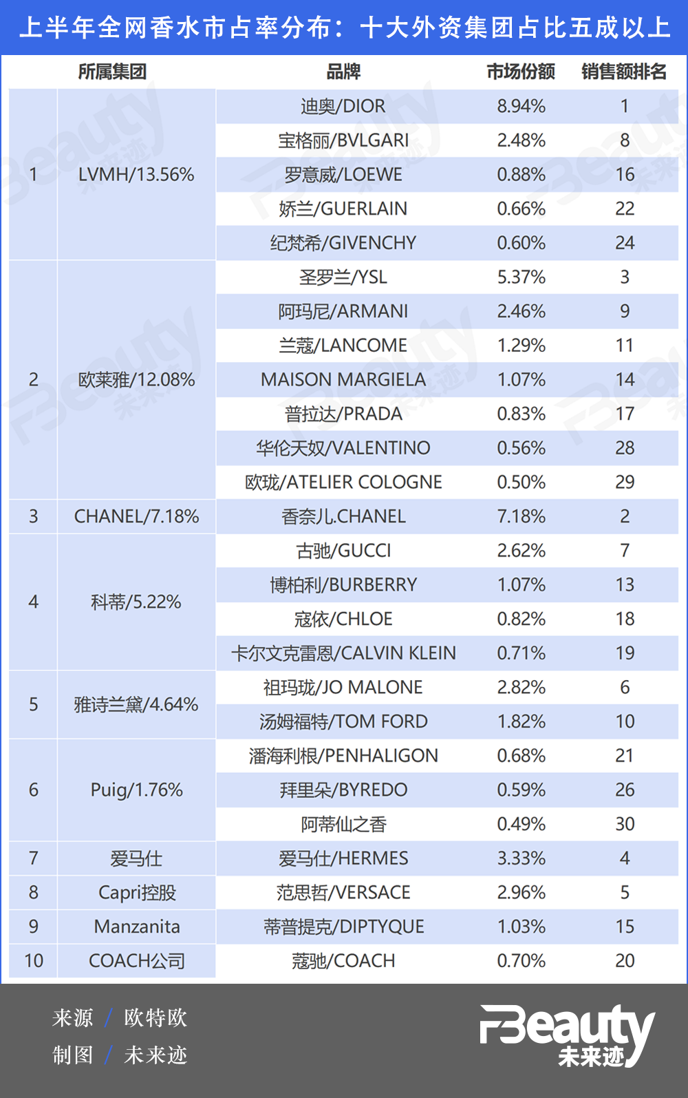 在此基礎(chǔ)上,歐特歐數(shù)據(jù)顯示,在2023年1-6月,線上香水市場仍然被十大外資集團(tuán)瓜分,但與十年前相比,競爭格局中的集團(tuán)和品牌已經(jīng)發(fā)生很大變化。