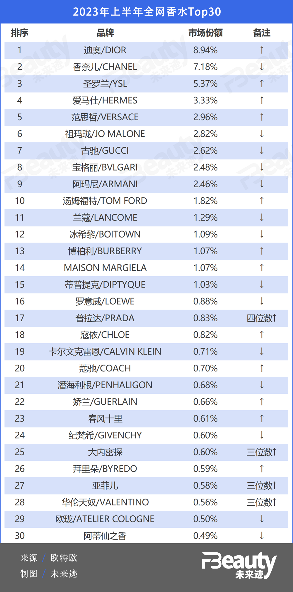 但2023年已經(jīng)過去大半,《FBeauty未來跡》從這些數(shù)據(jù)中發(fā)現(xiàn),香水市場的競爭格局又發(fā)生了一些戲劇性的新變化。