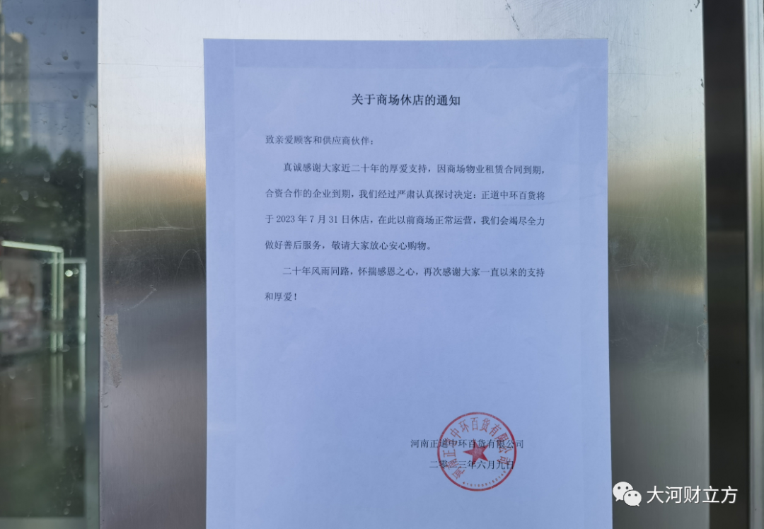 今年6月初,正道中環(huán)百貨掛出一紙閉店通告,使它在公眾視野中又刷一波存在感。公告稱:“因商場物業(yè)租賃合同到期,合資合作的企業(yè)到期,我們經(jīng)過嚴(yán)肅認(rèn)真探討決定:正道中環(huán)百貨將于2023年7月31日休店。”