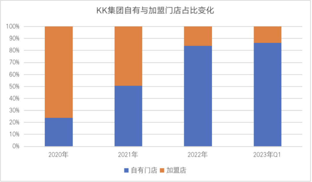并且這些新開(kāi)門(mén)店絕大部分為自有門(mén)店。近年KK集團(tuán)不斷提升自有門(mén)店占比,從2020年的占比2成左右上升至2023年一季度的近9成。KK集團(tuán)為何選擇了一條有別于加盟的自營(yíng)發(fā)展之路?