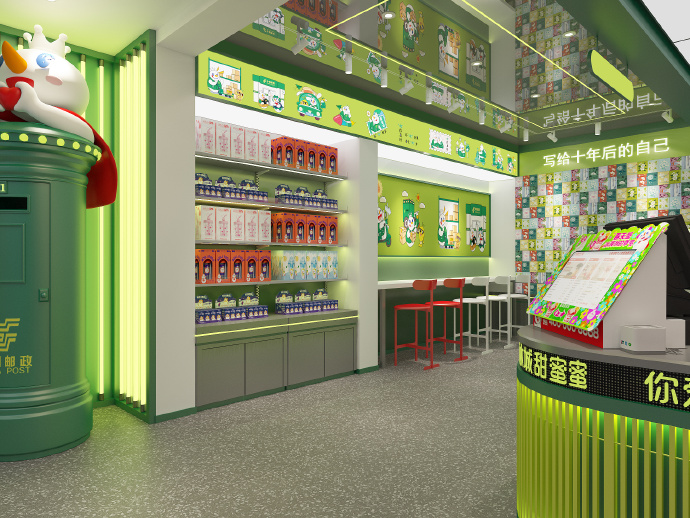 從蜜雪冰城公布的效果圖來看,門店以“蜜雪冰城主題郵局”為門頭,門口設(shè)有一個“雪王版郵筒”。門店內(nèi)部整體以綠色為主基調(diào),其中一面墻布置了簡易就餐區(qū)和蜜雪周邊產(chǎn)品展示區(qū),另一面墻則設(shè)置了以“寫給十年后的自己”為主題的留言板。