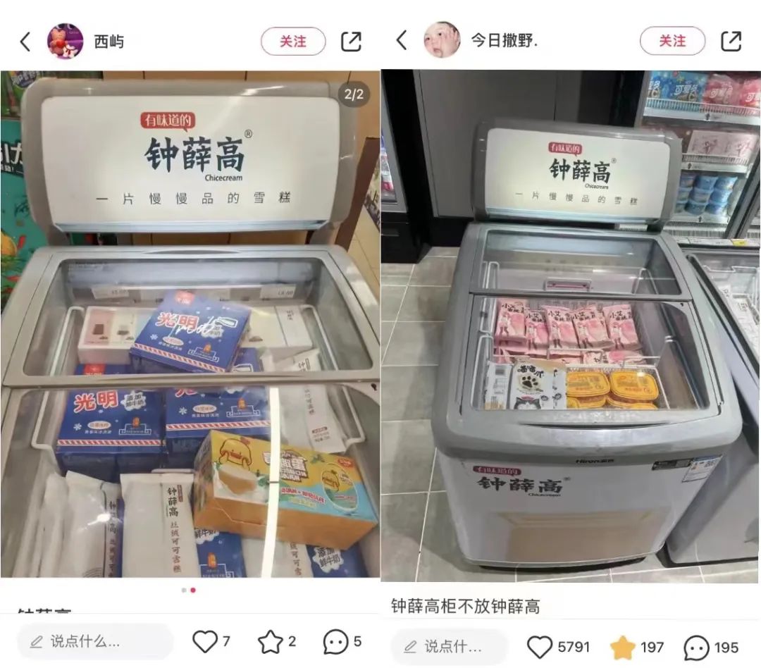 然而,與鐘薛高方面所提及的在終端上的投入相比,氫消費(fèi)注意到在小紅書上多位用戶分享的筆記中,鐘薛高的獨(dú)立冰柜中,并不僅僅擺放鐘薛高唯一品牌。