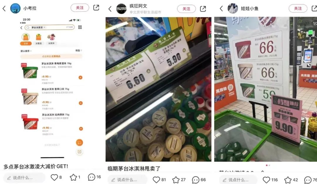 不僅鐘薛高,過(guò)去單價(jià)59元/66元一杯的茅臺(tái)冰淇淋,官方在7月10日至8月31日期間于線下旗艦店、線上旗艦店等渠道,推出了“買6杯贈(zèng)1杯”的活動(dòng),而在小紅書上用戶自發(fā)分享的素材中,可以看到,在多點(diǎn)APP和部分線下商超,臨期的單杯茅臺(tái)冰淇淋9.9元甚至更低的價(jià)格即可入手。