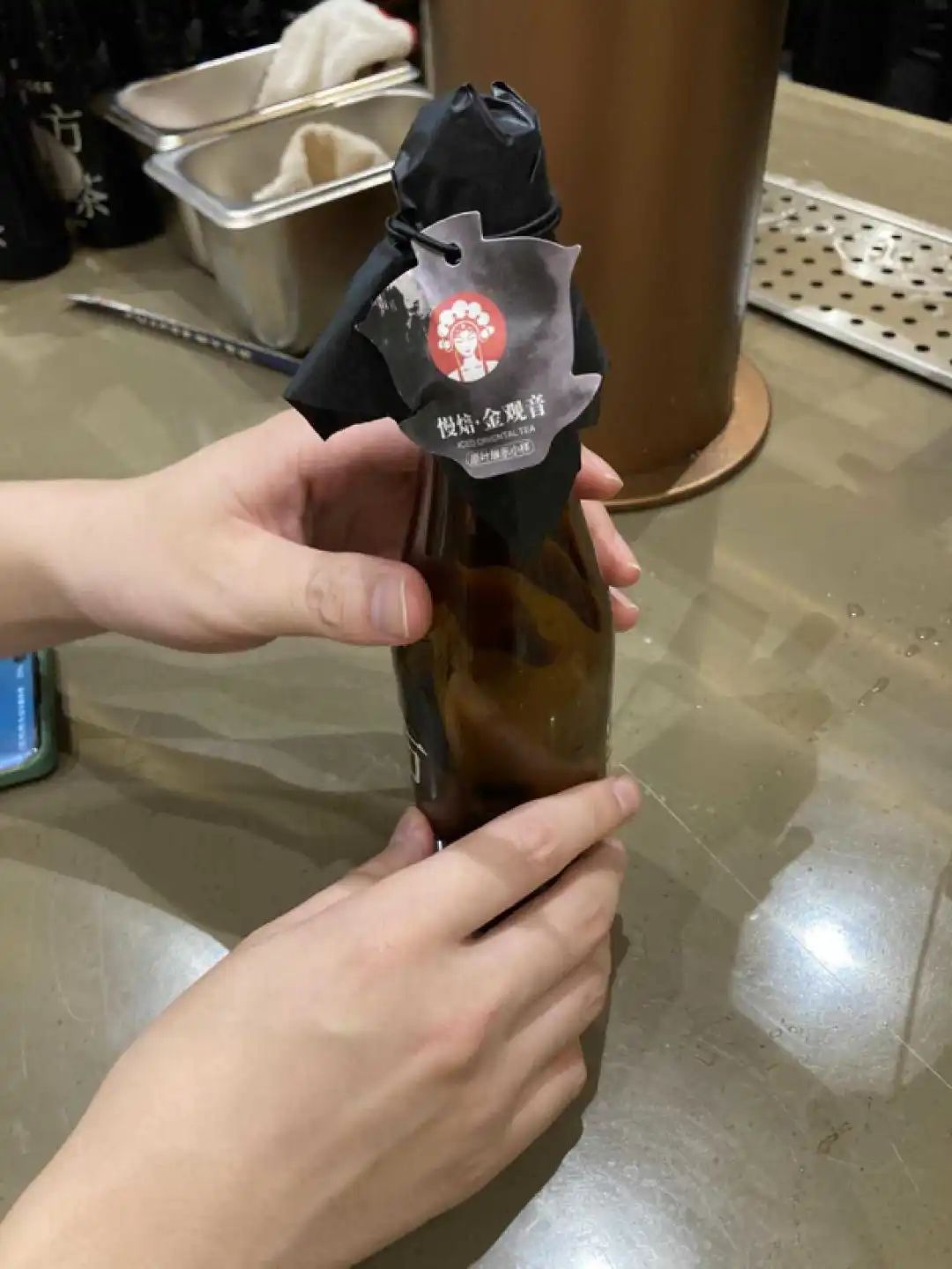 在東方冰茶這款飲品中,茶文化也體現(xiàn)的淋漓盡致。相較于傳統(tǒng)茶飲的紙杯或塑料杯,這款產(chǎn)品直接采用了茶色玻璃瓶作為容器,更加關(guān)鍵的是,這款飲品本身的制作流程,頗具儀式感。