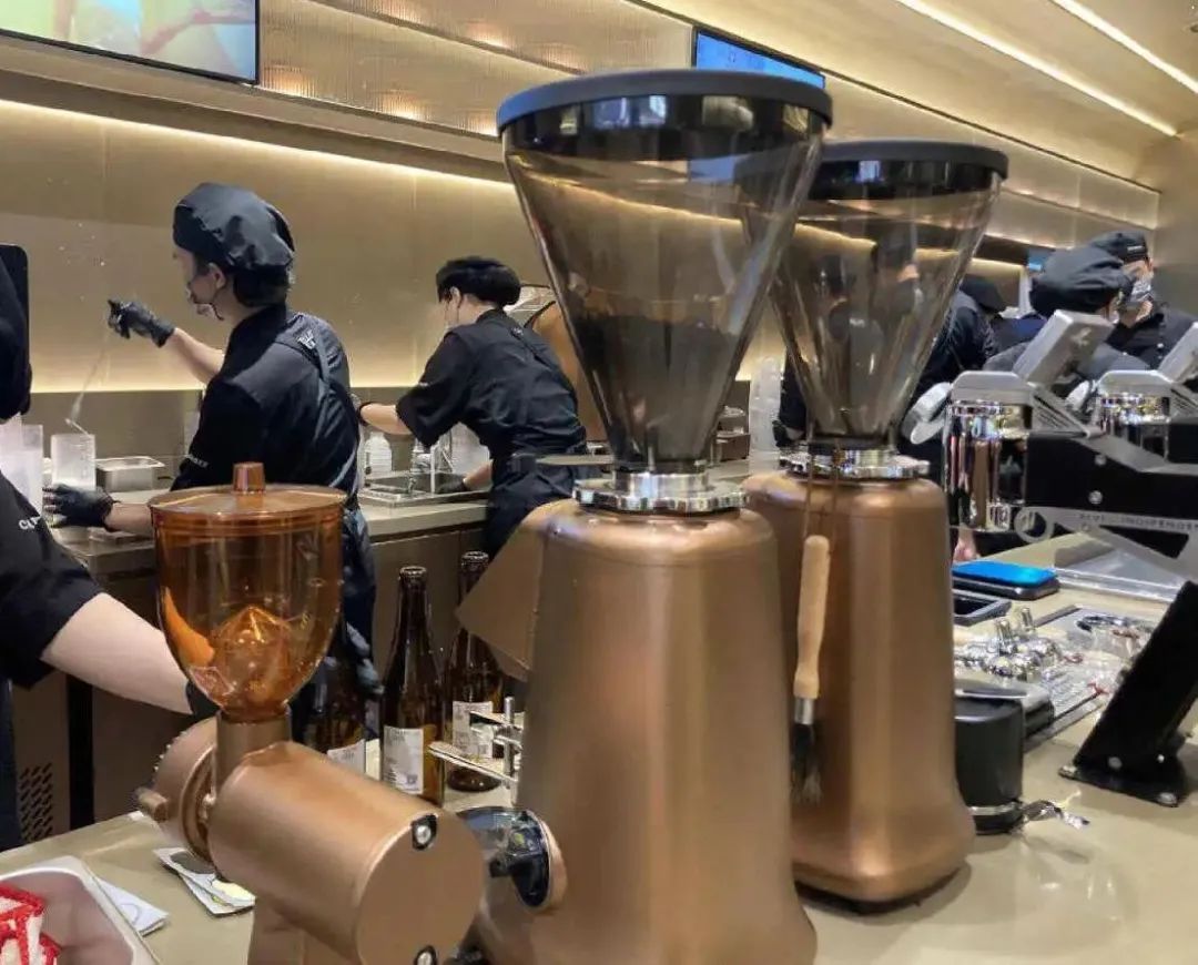 而在吧臺上擺放的研磨機,雖外形上與日?Х鹊曛械难心C類似,但細細觀察會發(fā)現(xiàn),在研磨機的儲物盒中放置的是茶葉,以霸王茶姬的大紅袍茶拿鐵的制作為例,先需要經(jīng)過研磨機對原葉研磨成茶粉,再通過霸王茶姬的“壓力閃萃”技術(shù),獲得濃縮茶湯原液,隨后將原液與優(yōu)質(zhì)牛乳進行融合出品。