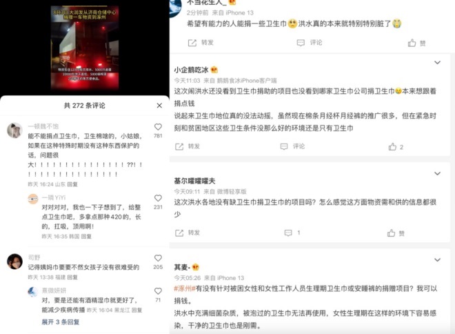 洪水中充滿細(xì)菌雜質(zhì),生理期的女性在這樣的環(huán)境下容易感染,干凈的衛(wèi)生巾是一種被容易忽略的剛需。在京津冀互助的相關(guān)帖子中,不少網(wǎng)友提到希望大家能關(guān)注暴雨洪澇后女性衛(wèi)生安全。