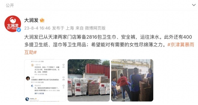 大潤發(fā)在涿州、淶水等地并沒有門店,注意到這一需求后,大潤發(fā)從天津兩家門店籌備了衛(wèi)生巾、安全褲、衛(wèi)生紙等用品,聯(lián)系到淶水婦聯(lián)并第一時(shí)間發(fā)車前往淶水。