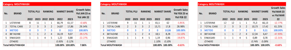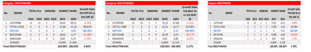 令當(dāng)?shù)厝寺愿畜@奇的是,2023年一季度以來,一款中國人做的漱口水開始在Indomaret和Alfamart攻城掠地。目前,這款名為Metoo的漱口水已達(dá)到該品類KA渠道(大型連鎖商超渠道,如沃爾瑪)的銷量前三。而在上線至今的15個(gè)月的時(shí)間里,它早已在TikTok等電商端銷量登頂。